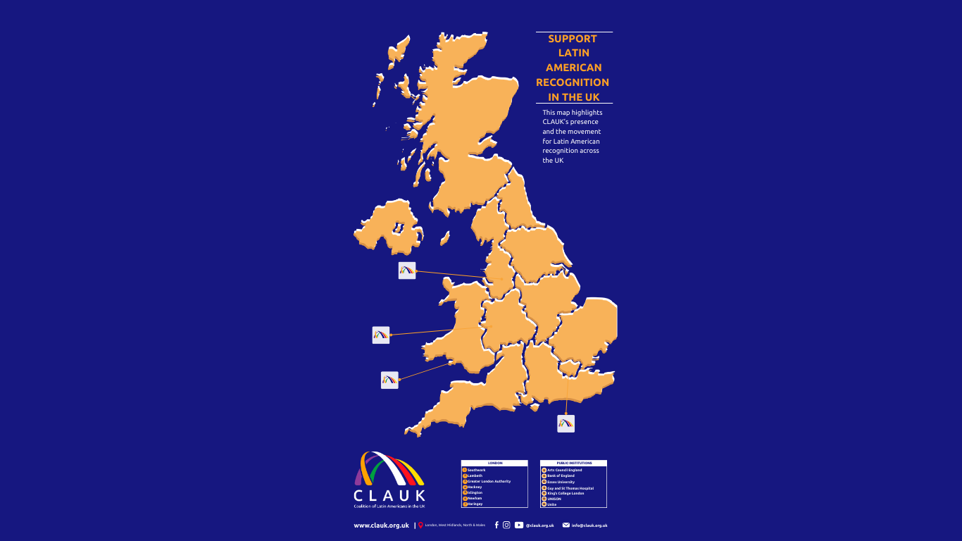 The Coalition of Latin Americans in the UK (CLAUK) is a group of ‘led by and for’ Latin American migrant organisations, initiatives, and passionate individuals actively collaborating to raise awareness of the issues affecting Latin American communities, amplifying our collective voice, and building systemic change through policy-influencing campaigning and capacity-building.